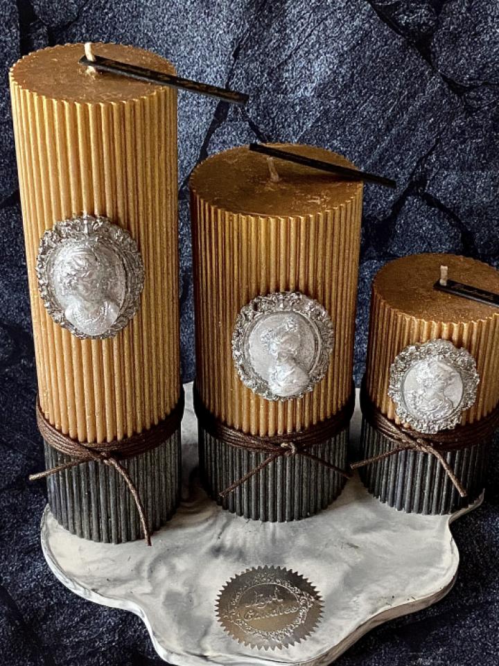 Set de 3 lumanari care creaza o dispozitie sofisticata si impunatoare.Imbina perfect stilul medieval cu cel contemporan fiind accesorizate cu 3 figuri diverse de domnite ale curtii regale si cu cate un snur maro cerat.